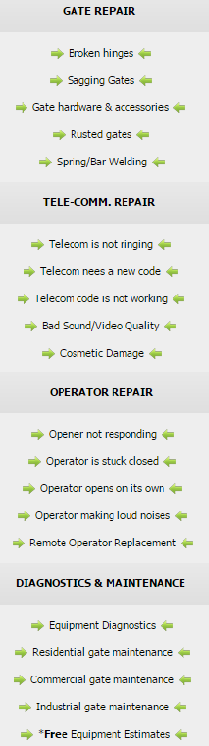 Duncanville Electric Gate Repair Tx specializes in the service and repair of electric gates also known as auto gate,electrical gate, electronic gate, automatic gates or motorized gates. We are authorized by all major brands to perform, maintain, service and install electric gate equipment.hether you need to repair a single component of the gate system or the entire system – we can do it all.
